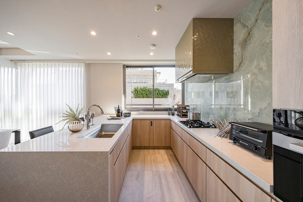 お濠に映る月光をイメージしたキッチンエリア。