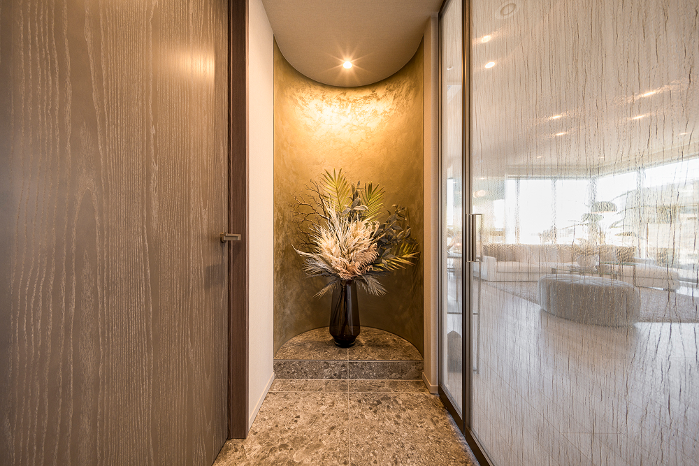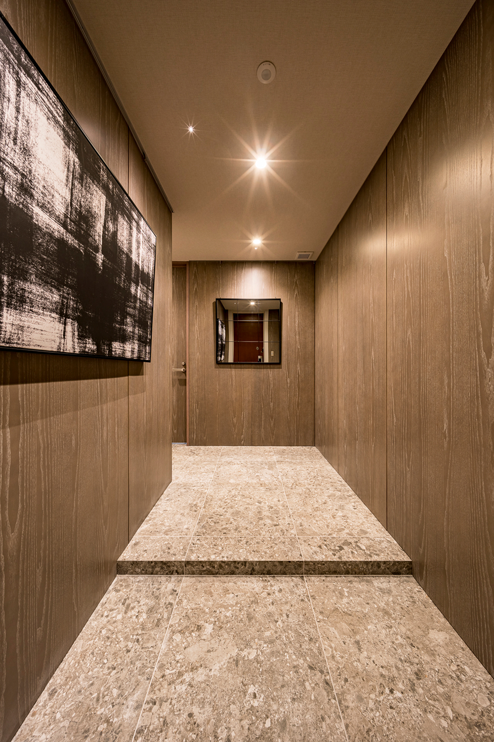 美しい木目をもつ突板パネルを貼り合わせ、エントランスに落ち着きをもたらす。